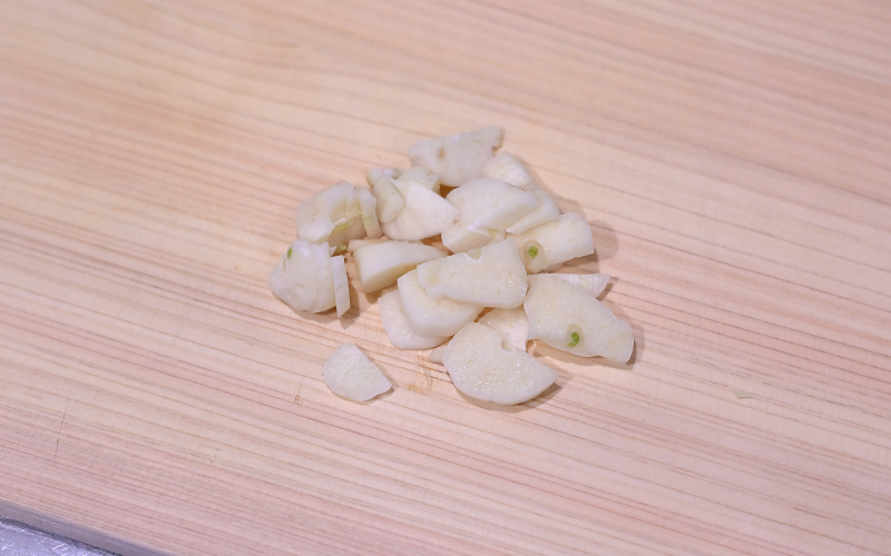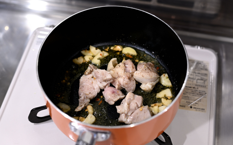 3.ニンニクが柔らかくなってきたら鶏肉を入れ火が通るまで炒める