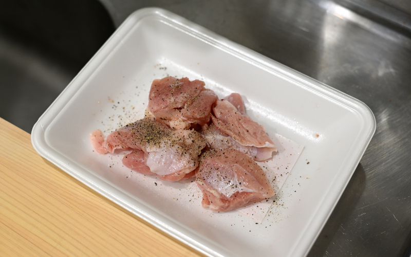 2.鶏肉に塩(1gくらい)、胡椒をしておく