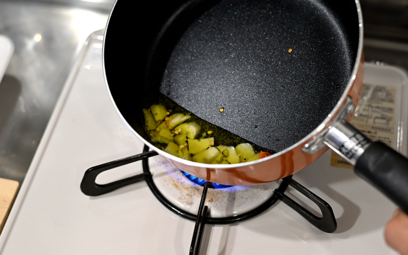 1.直径18cmの鍋にオリーブオイルを入れ、薄切りにしたニンニクと手でちぎった赤唐辛子を入れて弱火でニンニクが柔なくなるくらいゆっくり炒める
