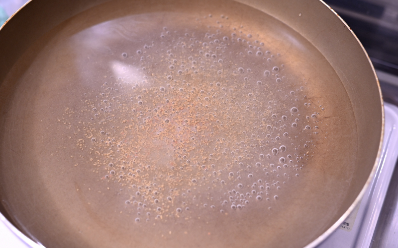 5.茹で上がる直前に、茹で汁を鍋に大さじ3杯くらい入れる