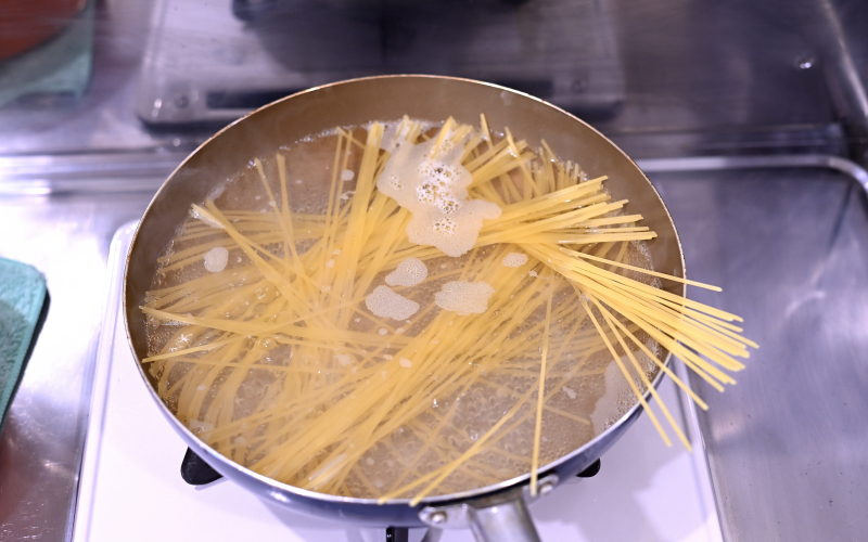 4.直径26cmの鍋に水を入れ残りの塩(2gくらい)と、今回のポイントである『ほんだし』を入れ沸騰させパスタを投入。規制時間茹でる