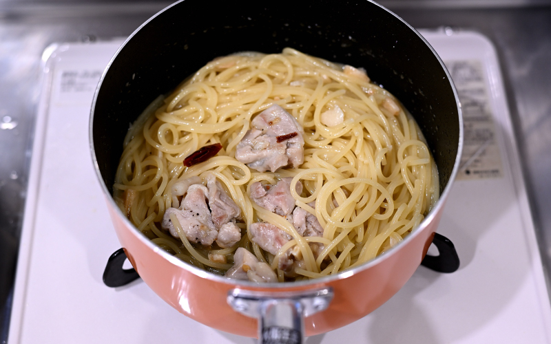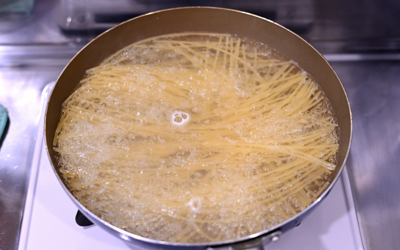 6.パスタが茹で上がったら、茹で汁を入れた鍋を火にかけ、茹で上がったパスタを投入し、よく混ぜ合わせる