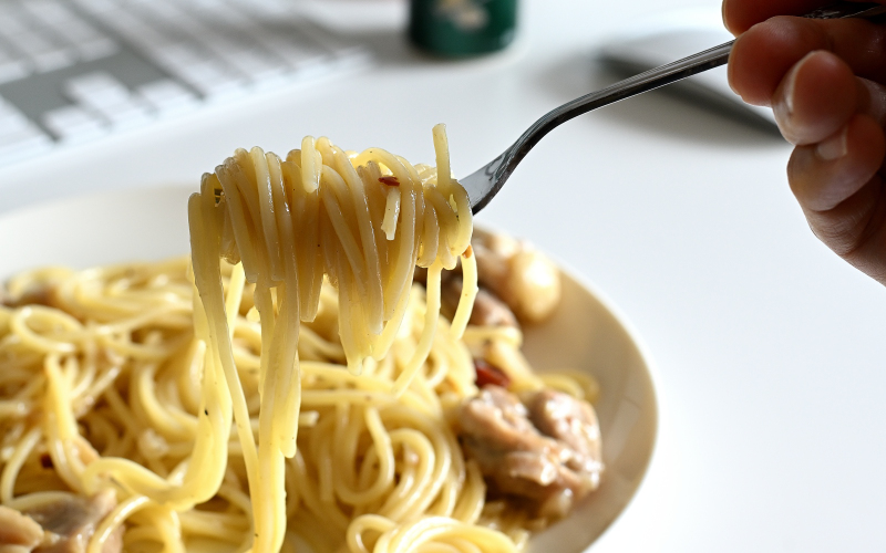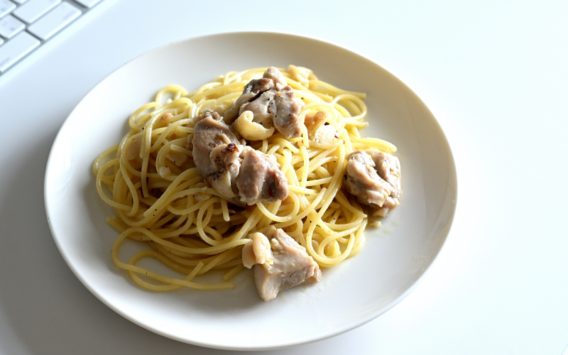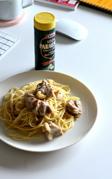 ということで言うと、今回は私が大好きなチキンを入れているし、ちょっとした調味料も入れているので正式なペペロンチーノではないのですが、ペペロンチーノのバリエーションと思っていただけると幸いです…。